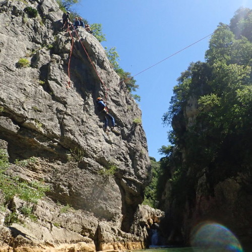 After a small Garrigue (a particular french habitate) hiking, we will start by floating, followed by multiple jumps, zip line splash and giant natural pools. The finish is materilized by the mythical spider abseiling.