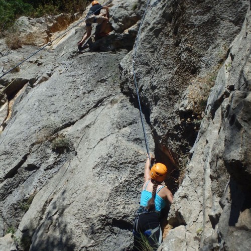 As on a schooled site or not your guide will familiarized with the climbing materials: climbing harness, descender for climbing, helmet and of course the rope.